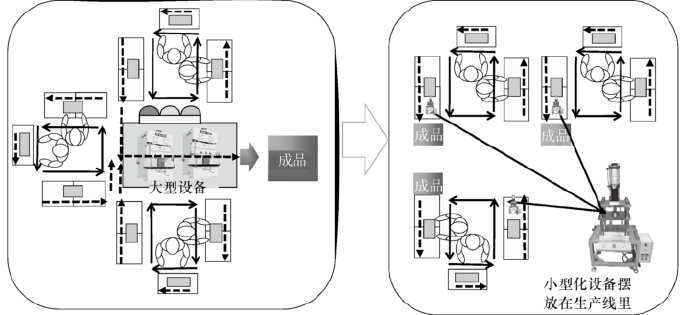 大型設(shè)備往往會(huì)為了追求生產(chǎn)的最大化而犧牲產(chǎn)品的切換次數(shù),這容易造成生產(chǎn)過量,生產(chǎn)了很多不需要的產(chǎn)品放到倉庫中。另外,大型設(shè)備在做流程化生產(chǎn)時(shí),很難編排到生產(chǎn)線中形成連續(xù)流,這是因?yàn)樵O(shè)備太大、設(shè)備運(yùn)行速度過快、很多生產(chǎn)線共用導(dǎo)致的。同時(shí),大型設(shè)備的操作區(qū)域比較大,容易造成動(dòng)作浪費(fèi)和移動(dòng)上的浪費(fèi)。小型設(shè)備具有以下特點(diǎn):節(jié)省空間,設(shè)備之間的距離比較近,當(dāng)流程變化或?qū)嶒?yàn)新產(chǎn)品時(shí),把它們移動(dòng)到另外的地方更容易。設(shè)備小型化,價(jià)格也就更便宜,這樣可以進(jìn)一步擴(kuò)大生產(chǎn)線,同時(shí)由于小型設(shè)備的穩(wěn)定性較強(qiáng),可以減少維修的等待時(shí)間。小型化設(shè)備改善如下圖所示。